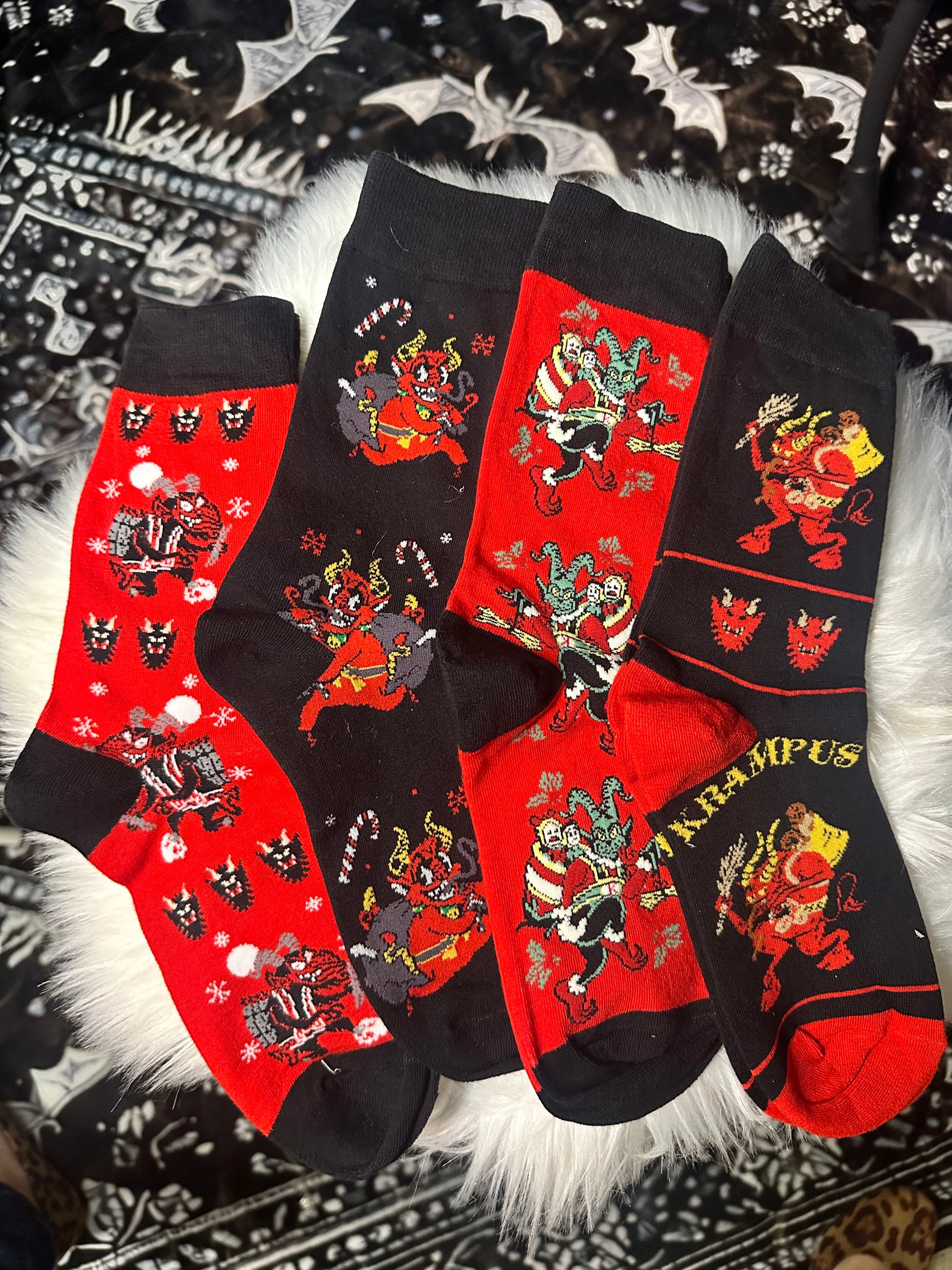 Limited Edition Christmas edition Dark Romance blind date with a book is more than the normal options! Dark Romance with a Christmas theme for a festive good time with themed items more than the typical blind date options. Each book comes with Krampus themed stickers, bookmark, tea or cocoa ( you choose in options), candy cane, 3 themed ornaments, nightmare before Christmas face mask, velvet hair tie, Krampus themed socks. 2nd photo shows variety of Krampus themed socks that will be included.