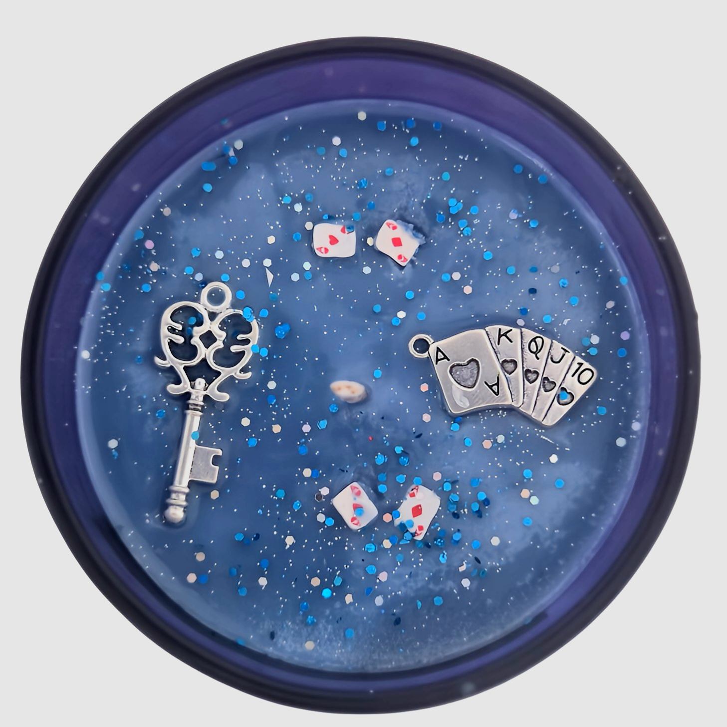 🕯 Product Details: From UK. Wax: 30cl soy wax candle, adorned with symbolic charms Vessel: Matt Blue Luxe Glass with a touch of rebellious elegance Fragrance: Black raspberries & velvety vanilla cream, innocent at first breath, addictive underneath Theme: Alice reimagined, bold, unbound & dangerously charming Packaging: Illustrated story card & candle care card in a black envelope, ready to gift