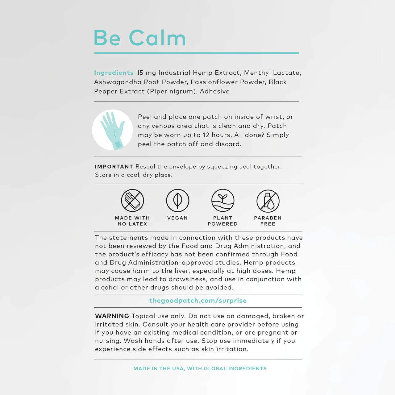Be Calm- A hemp-powered wearable wellness patch for stressful days. Infused with 15mg Premium Hemp Extract, Ashwagandha, and Passionflower. The perfect patch for when you’re at a ten and you want to be at a two.