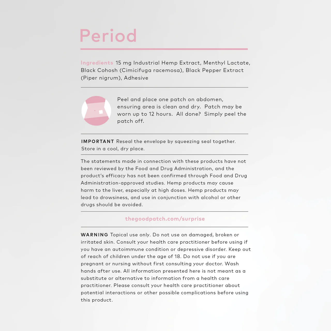 Period-A hemp-powered wearable wellness patch for that time of the month. Infused with 15mg Premium Hemp Extract, Menthyl Lactate, and Black Cohosh. Don't cramp your style. Take control of your flow.